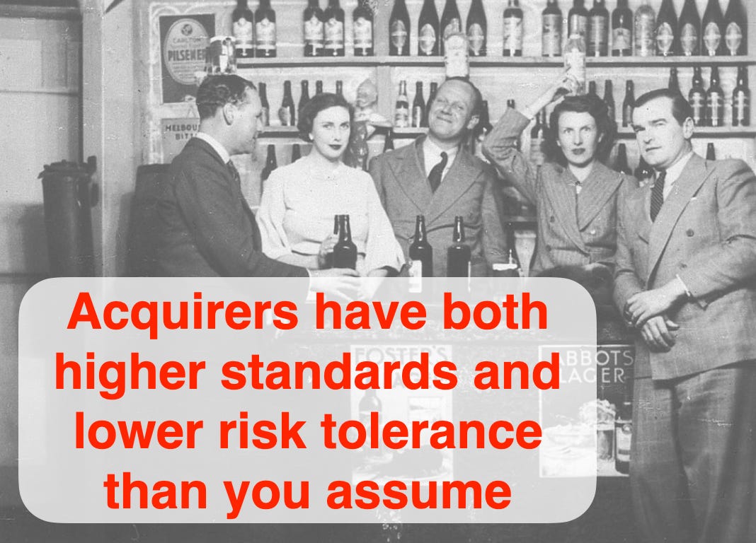 Know that a strategic’s appetite for risk is considerably lower than that of an entrepreneur’s. Market validation is measured by hard data on customer and consumer loyalty, not just fancy bar listings. Show increasing same-store velocity. Demonstrate sustained repeat purchasing behavior.